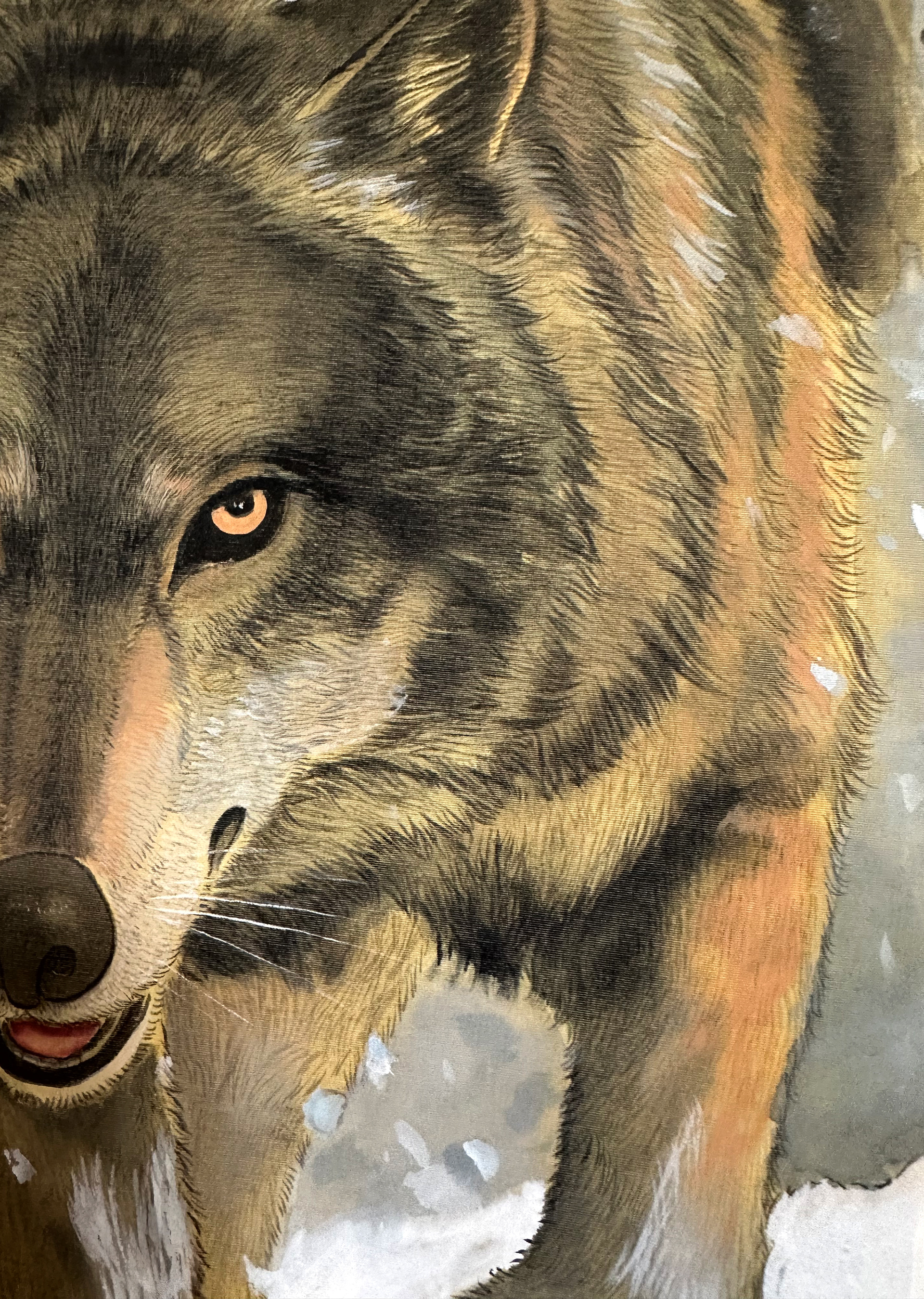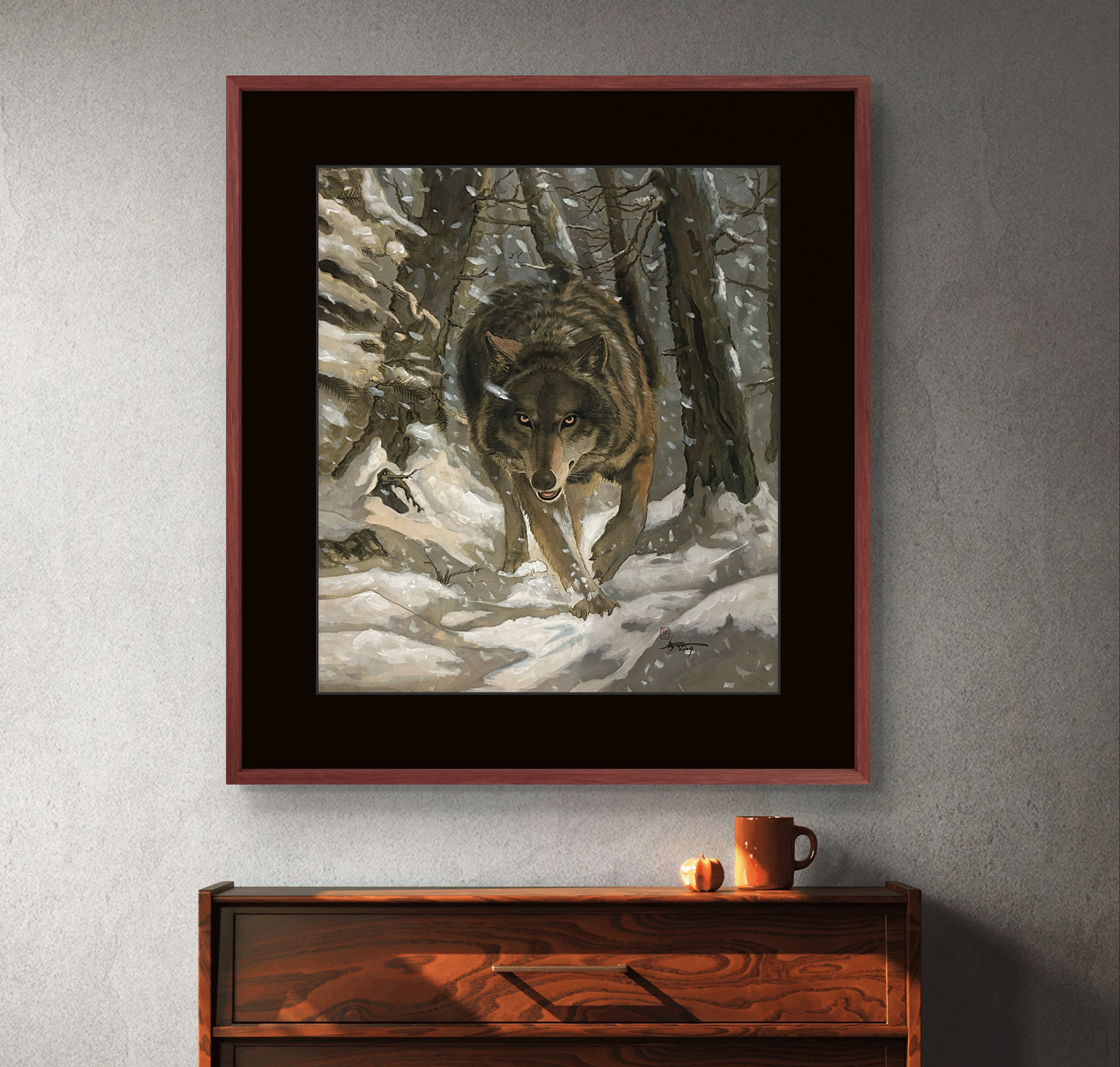 « Prédateur des Neiges » est une œuvre majeure de la série Symbiose des vies. La silhouette du prédateur, avançant dans le vent et la neige, incarne le rôle que la nature lui a attribué. Ce rôle, chargé d’une force qui dépasse la simple existence physique, révèle autant son instinct de survie que sa sagesse propre. Chaque pas qu’il trace dans cet univers glacé s’inscrit à la fois dans le rythme profond de la nature et dans l’affirmation de son identité en tant qu’individu. Cette relation intime avec la nature confère à l’existence une tension et une profondeur inégalées.