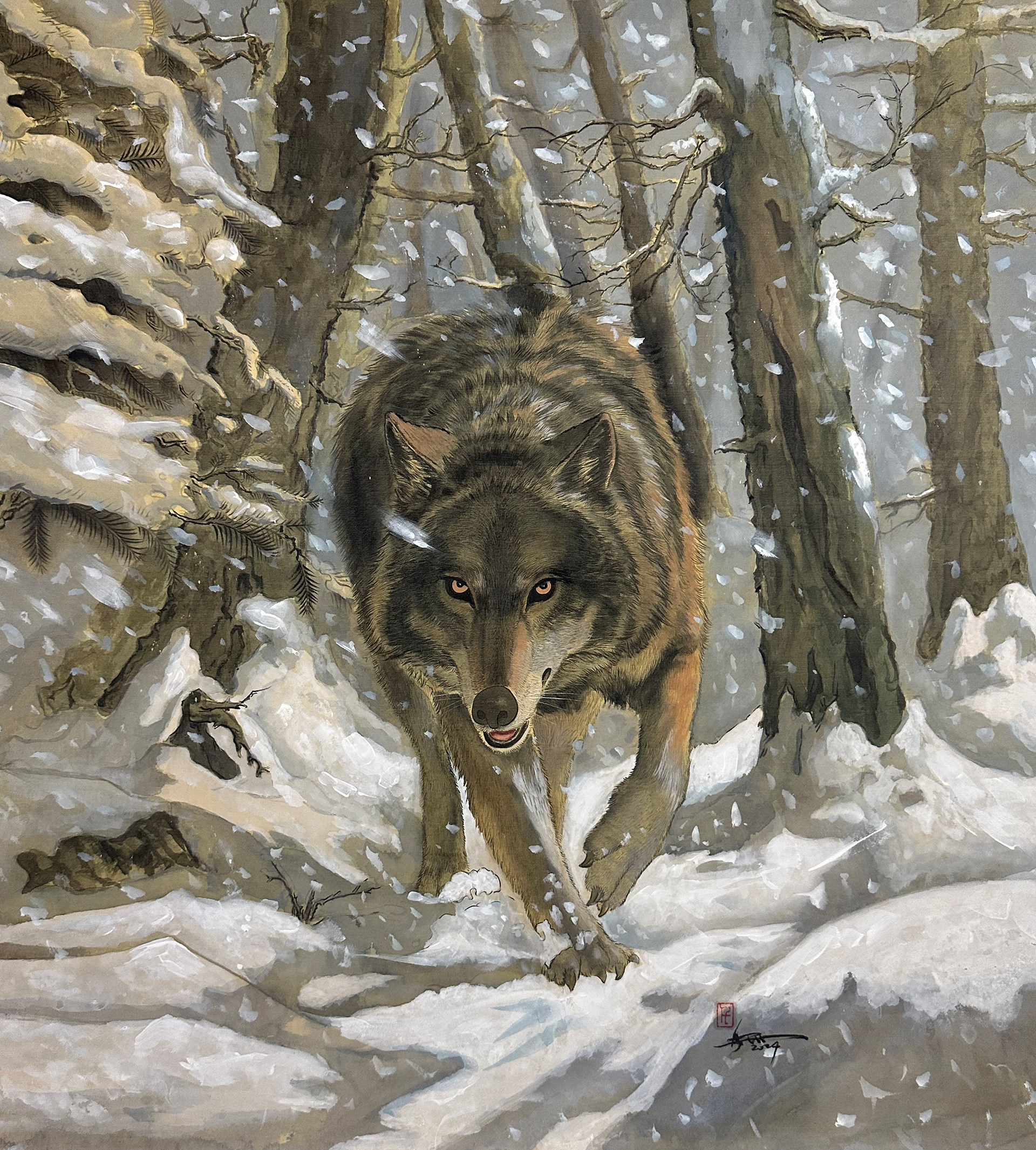Cette œuvre a été réalisée par Alix Xu en utilisant la technique minutieuse de la peinture chinoise gongbi et peinte sur soie. À travers des traits précis et délicats, elle dépeint avec justesse la puissance intérieure et l’harmonie complexe entre le prédateur et son environnement naturel.