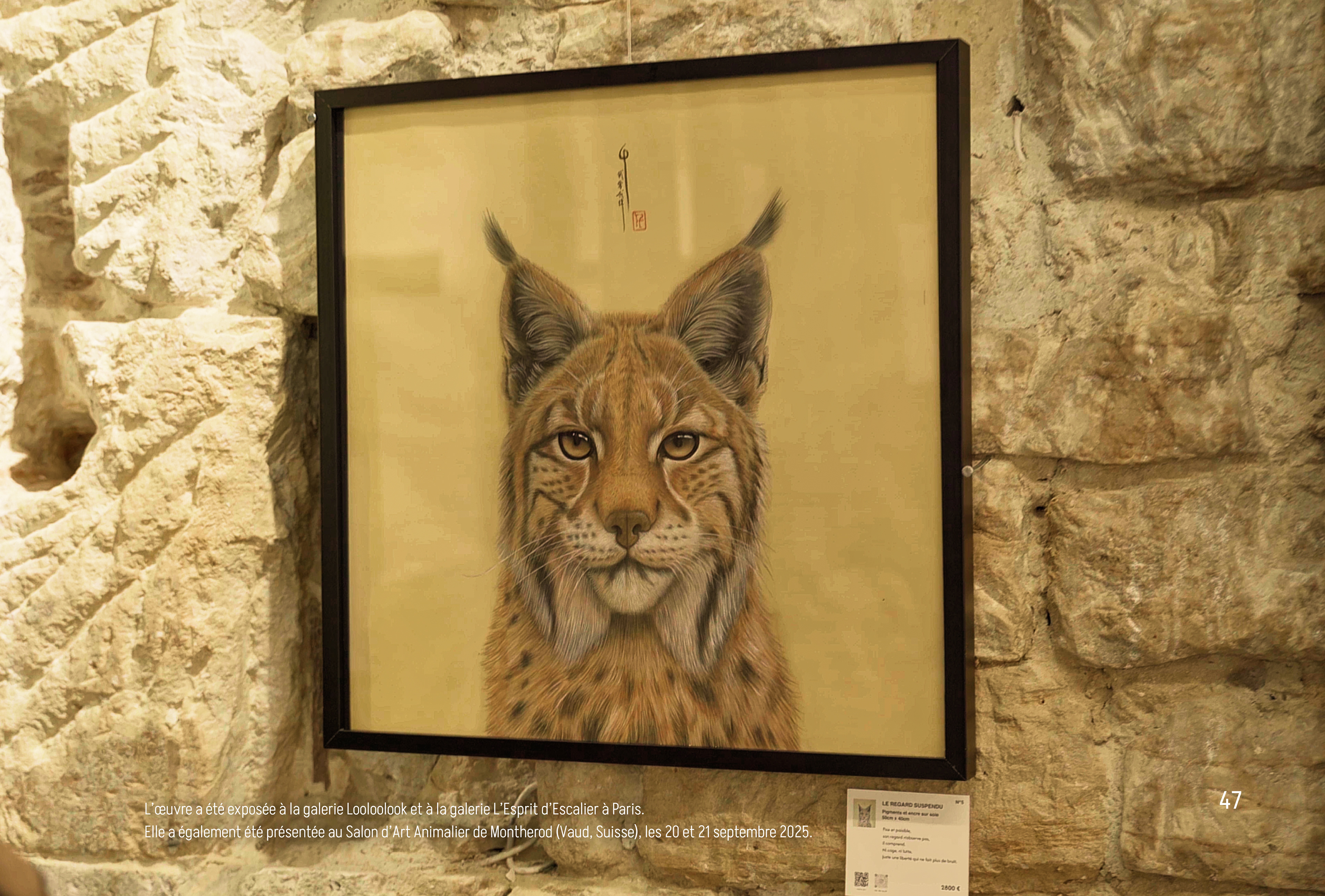 Peinture chinoise sur soie, 40x50cm | Présentée à la Galerie Looloolook Paris en février 2025, à la Galerie Esprit d’Escaliers à Paris en août 2025, puis au Salon Animalier de Montherod en Suisse en septembre 2025.