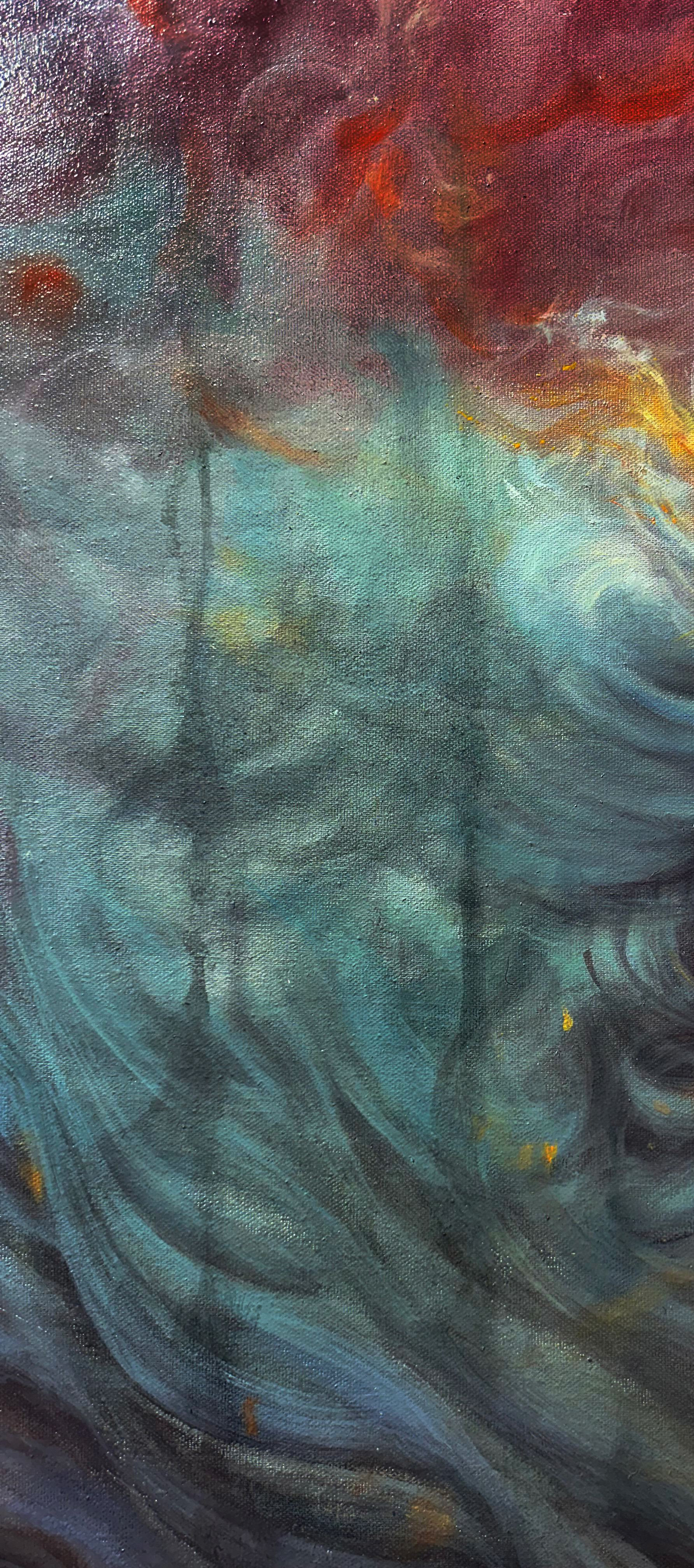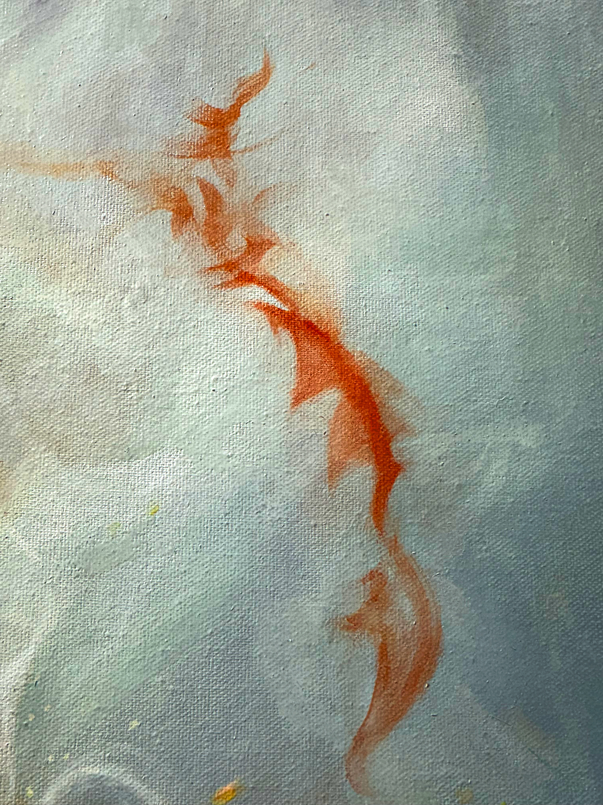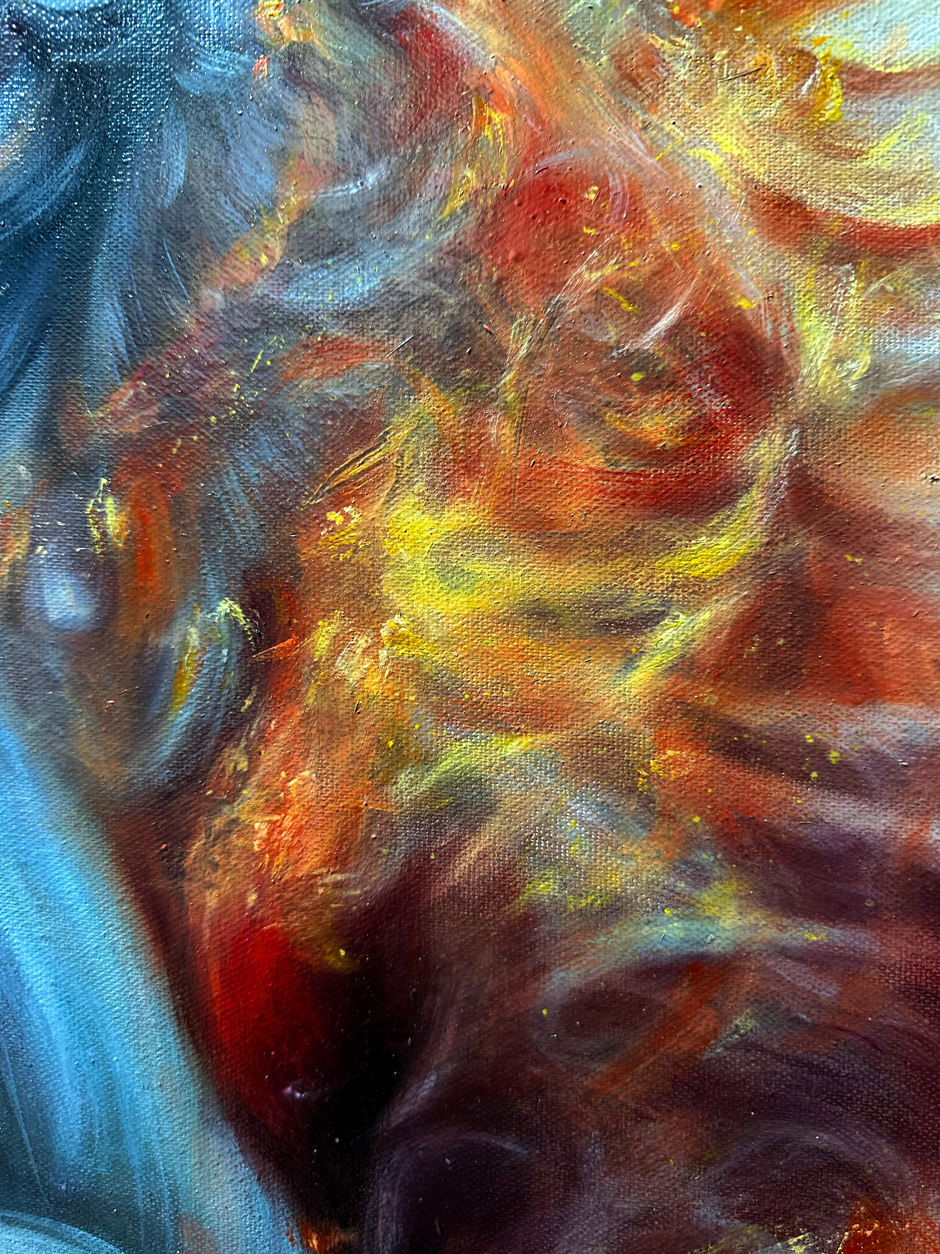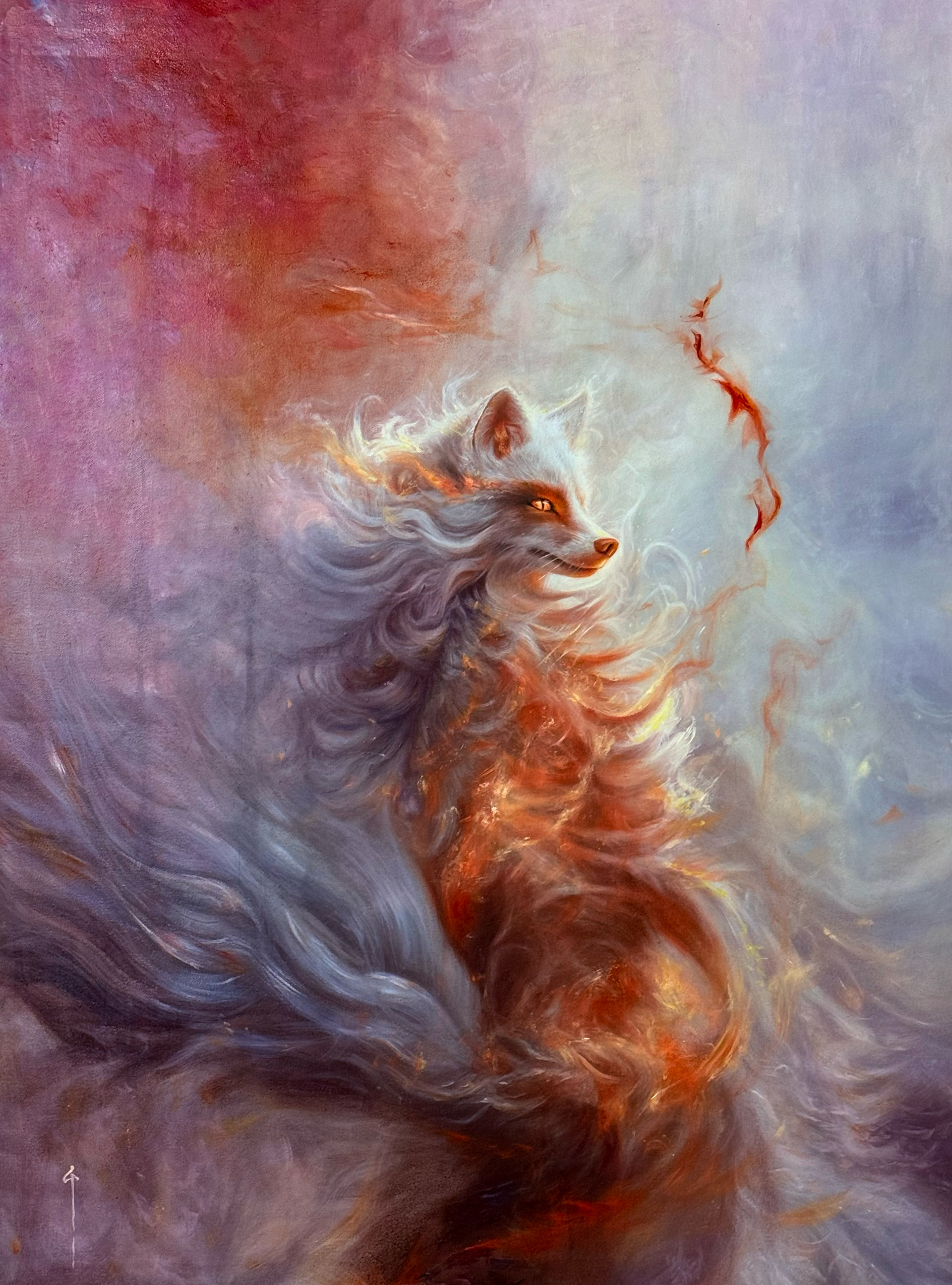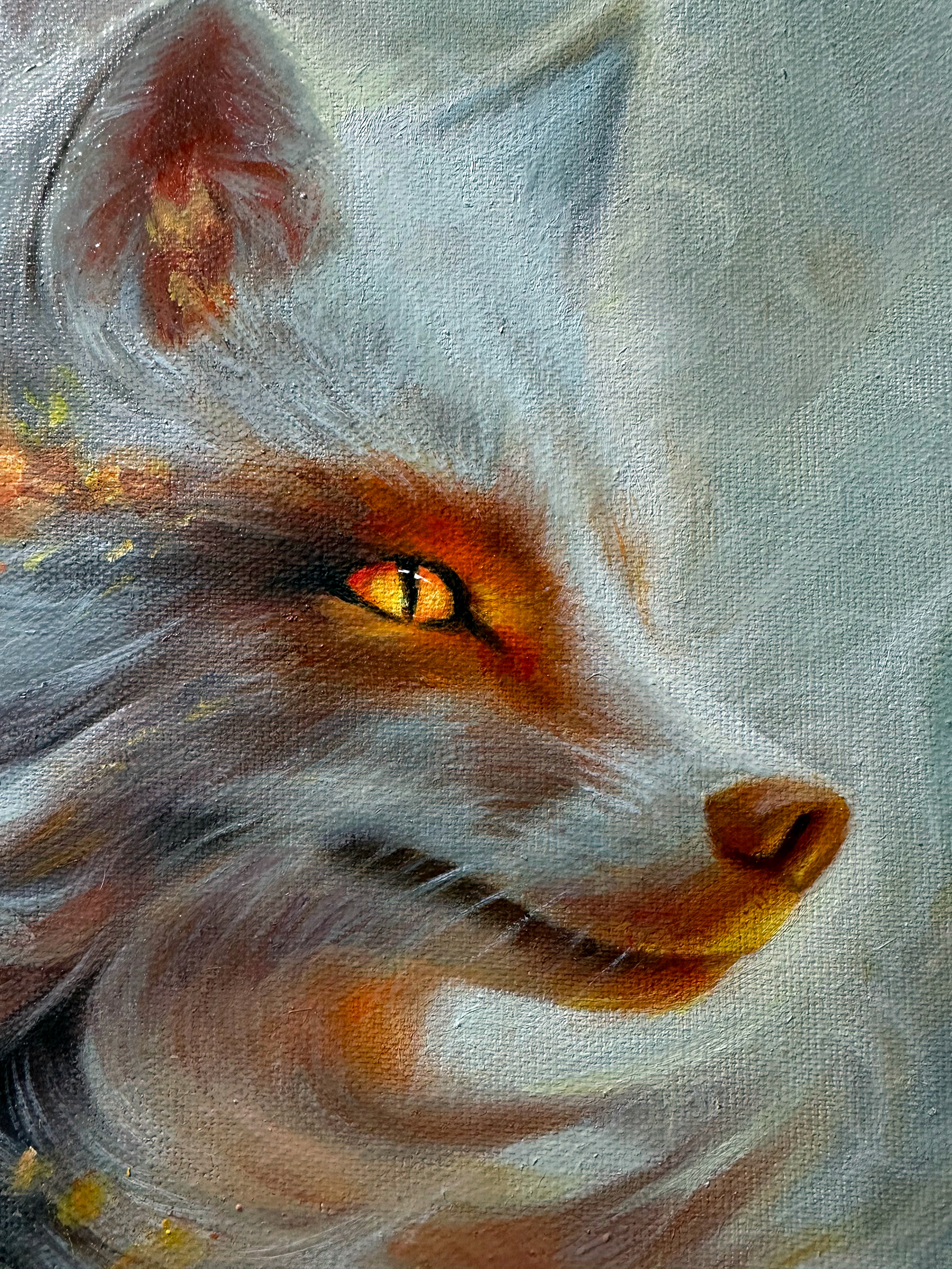 Dans cette œuvre, je voudrais exprimer la lumière maternelle, la force féminine. Je peins cette renarde. Mais ici, je parle de l’humain, j’exprime la métamorphose, l’être qui traverse l’épreuve. Elle avance dans la brûlure, les flammes dévorent son corps. Elle porte le poids du féminin — chaleur, douceur, résilience. Le monde prend, le temps use, la douleur marque, mais cette lumière, elle, ne faiblit pas. Quand je peins, c’est cela que je veux faire ressentir. Le feu n’est pas destruction, il est purification. Il ne consume pas la vie, mais ce qui l’entrave. Il dévore les chaînes, les peurs, les doutes, les tristesses. Ce qui brûle, ce ne sont pas elle, mais les obstacles. Les murs invisibles qui l’empêchent d’avancer. Et quand tout s’achève, quand la cendre retombe, l’essence apparaît. C’est une métamorphose. Un renouveau intérieur, profond, essentiel. Et c’est cela aussi, être une femme. Les épreuves, l’attente, les luttes, chaque pas en avant dans ce monde incertain forgent la reconstruction, la métamorphose, l’existence pleine et entière.